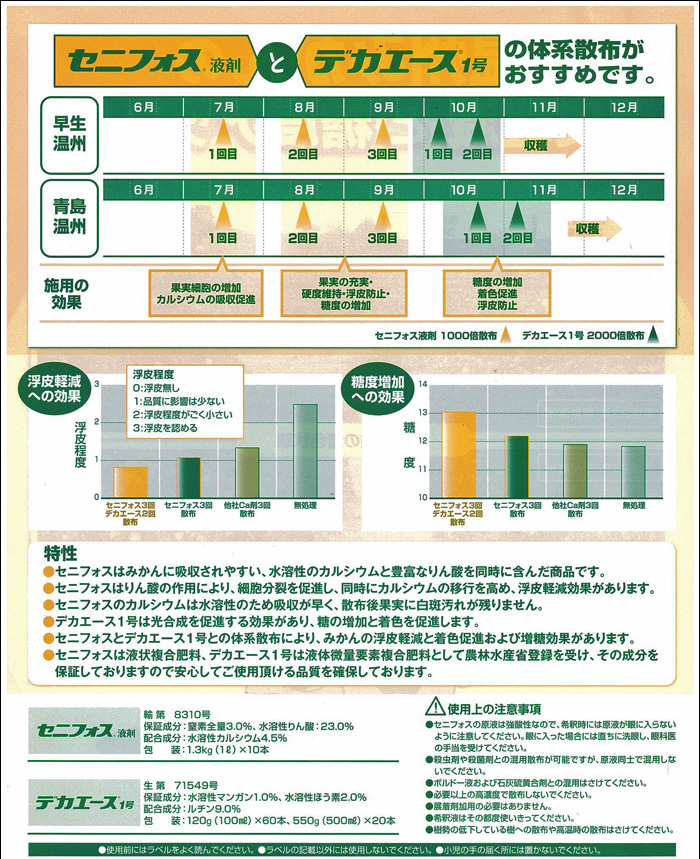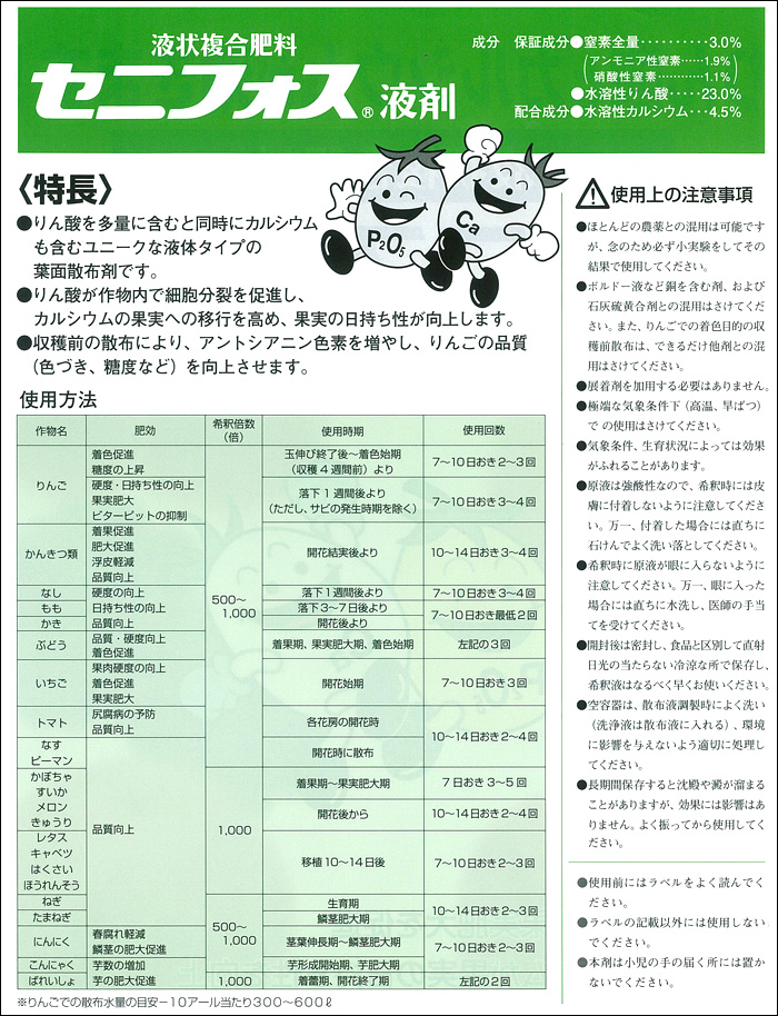商品説明: [成分]窒素3%、水溶性りん酸23%、水溶性カルシウム4.5% ・りん酸を多量に含むと同時にカルシウムも含むユニークな液体タイプの葉面散布剤です。・りん酸が作物内で細胞分裂を促進し、カルシウムの果実への移行を高め、果実の日持ち性が向上します。・品質(色づき、糖度など)向上、肥大促進の効果が期待できます。